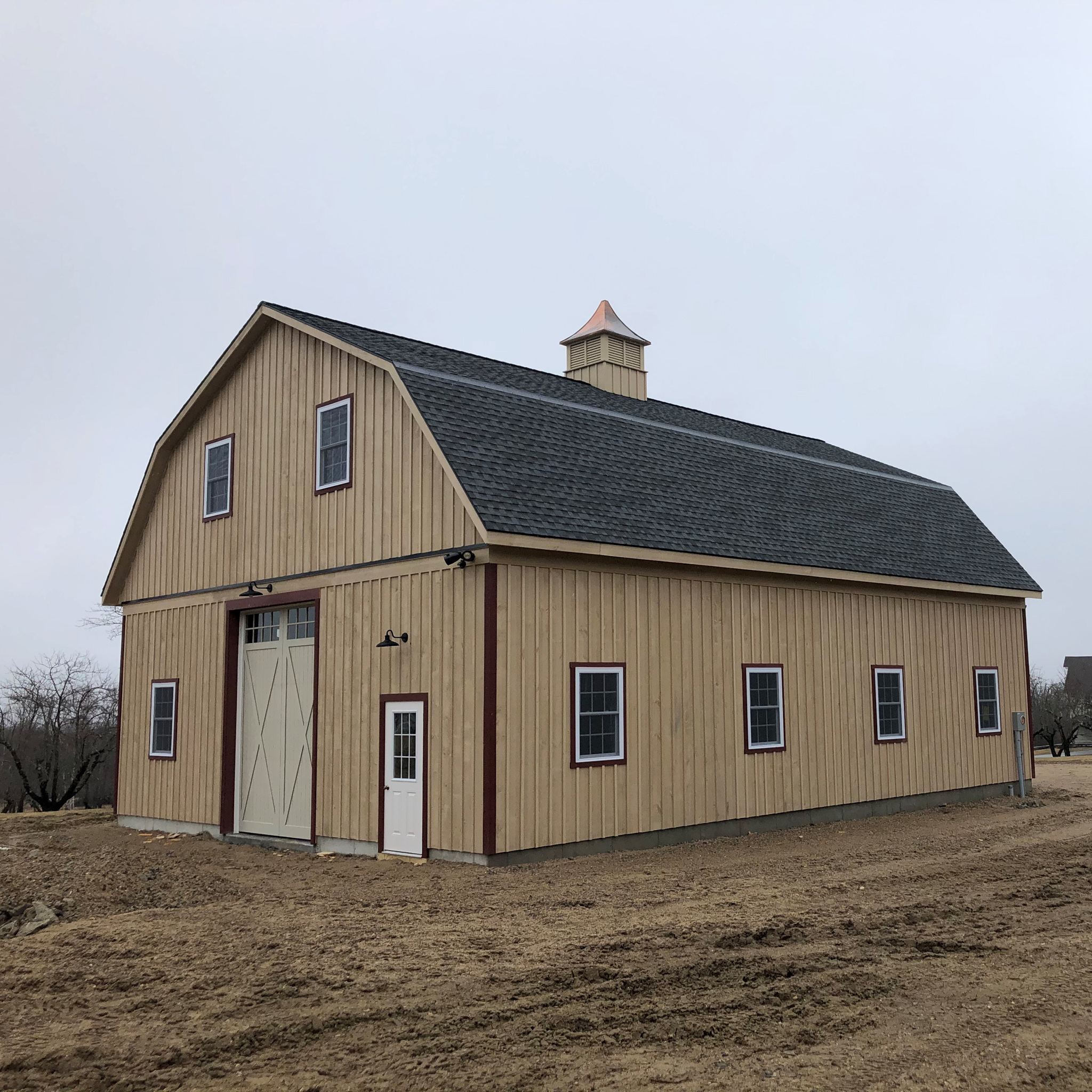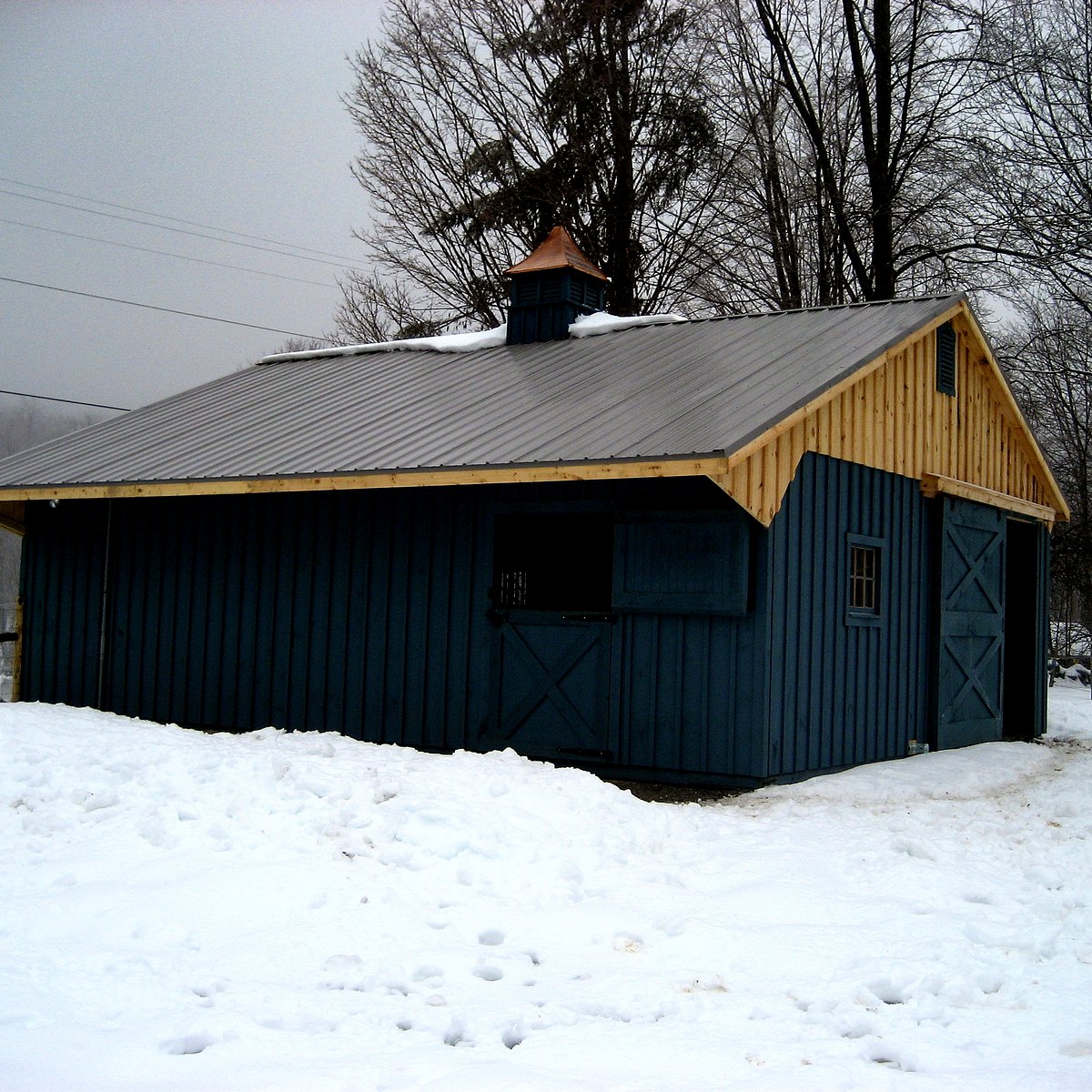 This custom building is considered a Carriage-Style horse barn. A carriage-style roof resembles a salt-box roof, where the rear side is a different height and pitch than the opposite side.